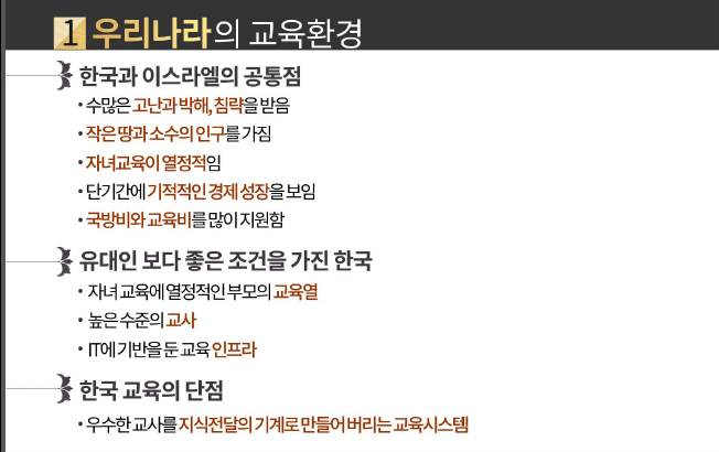 정리) 우리나라는 들어서 외우고 시험보고 잊어버리는 교육을 하지만 유대인은 묻고 답하고 토론하고 논쟁하며 생각하게 하는 교육을 하네요.