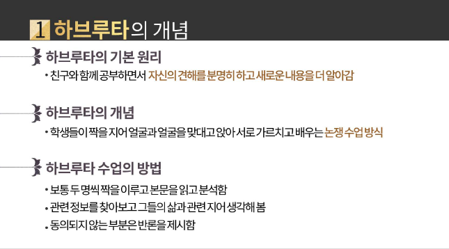 하브루타, 이게 무엇이죠? 하브루타 교육 개념은 친구와 함께 공부하며 자신의 견해를 분명히 하며 새로운 내용을 알아가는 방식이라고 합니다. 친구를 통해 학습하고 친구를 가르치며 학생이 교사가 되어 서로 가르치게 됨으로 상대를 가르쳐야 한다는 의무감을 갖고 학습능력을 높여간다네요. 하브루타는 친구와 짝을 이루어 프렌드십 때론 파트너십을 강조하고요. 정리하면 하브루타 개념은 본래 짝, 상대편이란 뜻에서 지금은 교육 방법을 뜻하는 총칭으로 사용되고, 짝을 이뤄 대화하고 토론하고 논쟁하는 것을 뜻한다고 합니다. 그러면 아래 사진을 통해 하브루타 개념과 위력을 정리해 보세요.