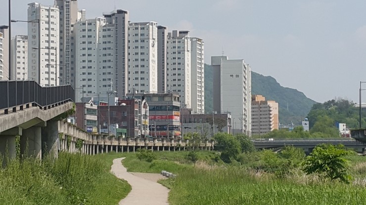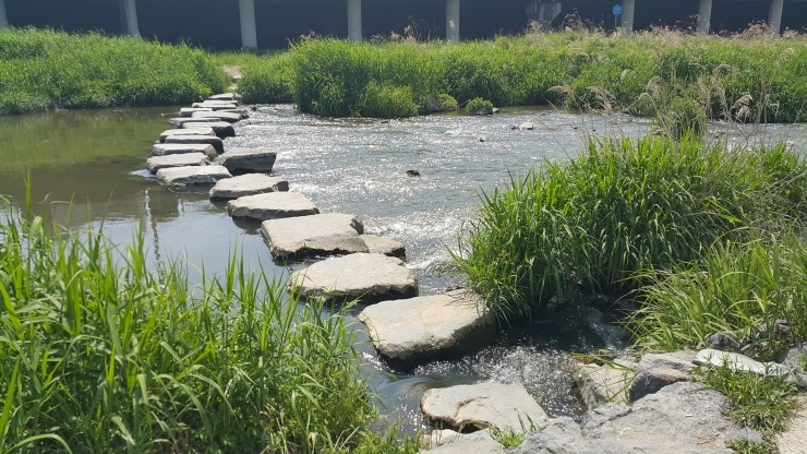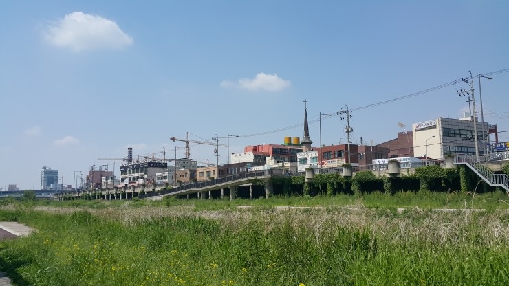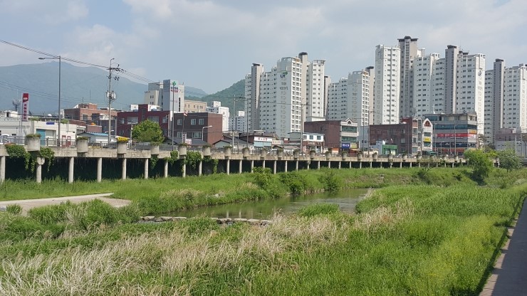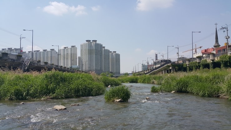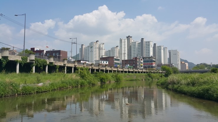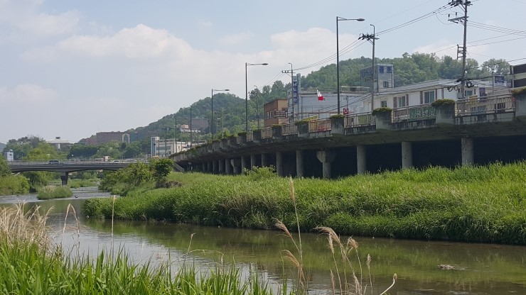 방림고가에서 내려다 보이는 광주천 모습, 차가 다니는 도로 복판이라 사진 찍기 어려운데 짜투리 시간이 생겨서 학동 부근 광주천 일대를 잠시 쭉 돌면서 옛날 어릴적 놀던 때의 추억을 사진에 담아보았습니다.